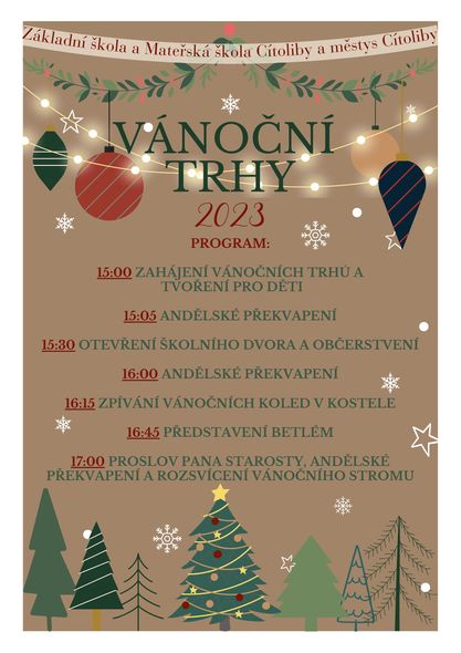 30. 11. Už se to blíží... 3. 12. zveme srdečně všechny na tradiční vánoční trhy a rozsvícení vánočního stromečku. Přijďte ochutnat sladké i slané dobroty, klobásky a třeba i bramboráčky, dále svařené víno a vánoční čaj. Své kreativní nadání uplatníte v tvořivých dílničkách při zdobení vánočních perníčků a jablíček. Nebudou chybět ani oblíbení koníci ze stáje U Růženky ze Stekníku.