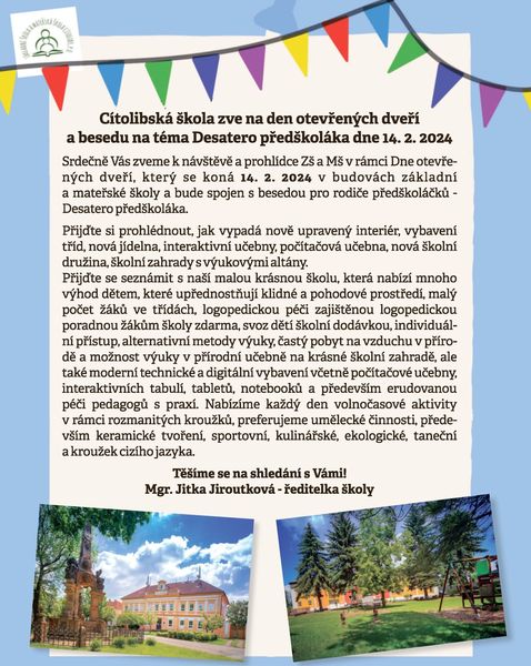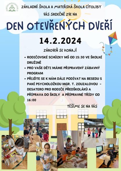 Srdečně všechny zveme na Den otevřených dveří a besedu s tématem Desatero předškoláka a příprava do první třídy pod vedením speciální pedagožky Mgr. T. Zouzalové dne 14. 2. 2024.