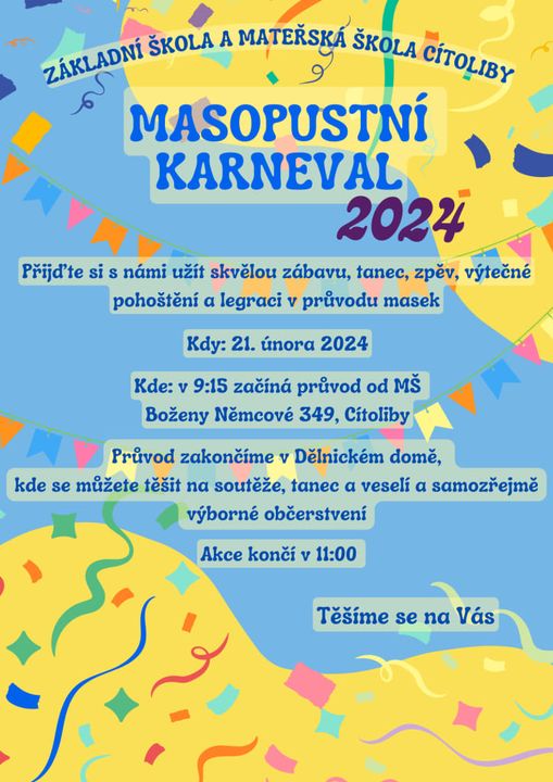 Srdečně všechny zveme na masopustní průvod a veselí v Dělnickém domě dne 21. 2. 2024 od 9. 15 do 11.00 hod.