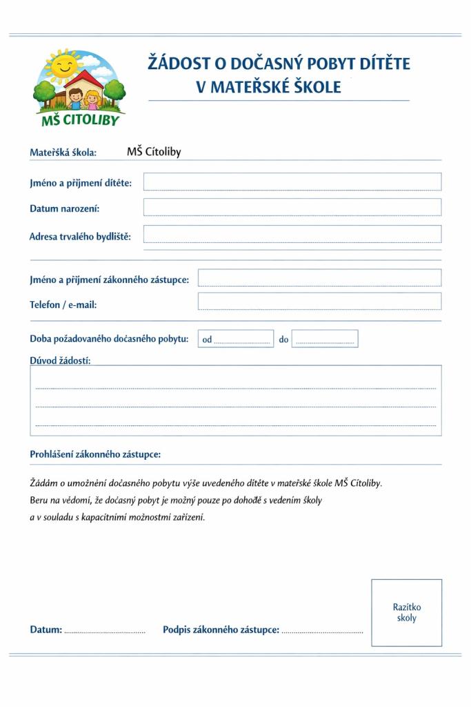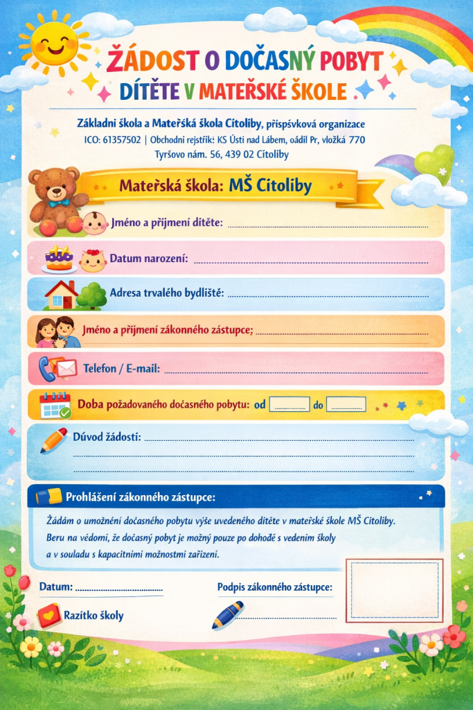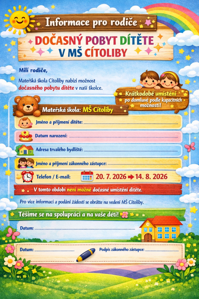 Milí rodiče, Mateřská škola Cítoliby nabízí možnost dočasného pobytu dítěte v naší školce. Tato služba je určena pro děti, které potřebují krátkodobé umístění v MŠ, například z důvodu pracovních nebo rodinných potřeb.