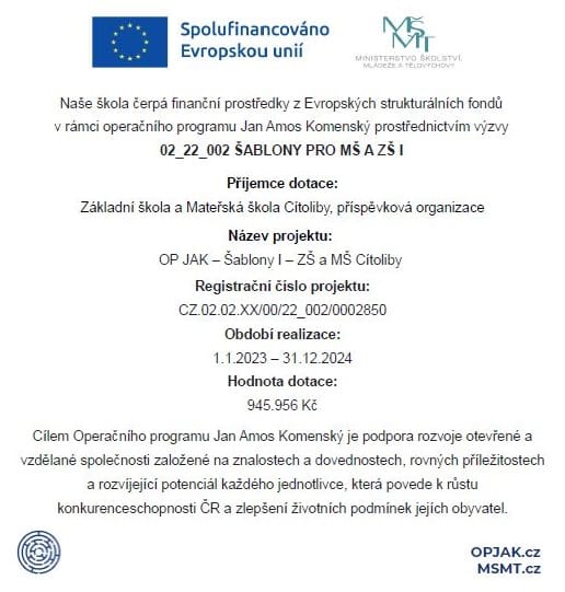 Naše škola čerpá finanční prostředky z Evropských strukturálních fondů v rámci operačního program J. A. Komenského prostřednictvím výzvy OP JAK _ Šablony , registrační číslo projektu - CZ02.02.XX/00/22_002/0002850