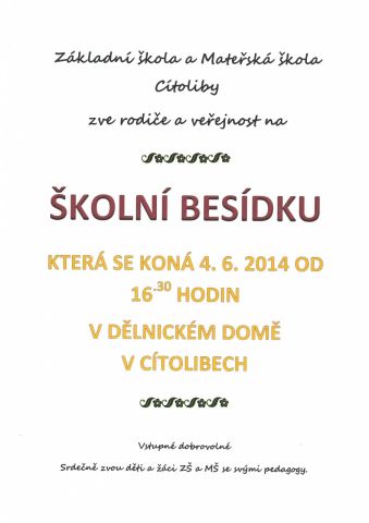 Srdečně zveme rodiče, příbuzné a veřejnost do Dělnického domu ve středu 4.6.2014, kde se koná od 16,30 hodin vystoupení dětí a žáků školy. Vstupné zdarma.